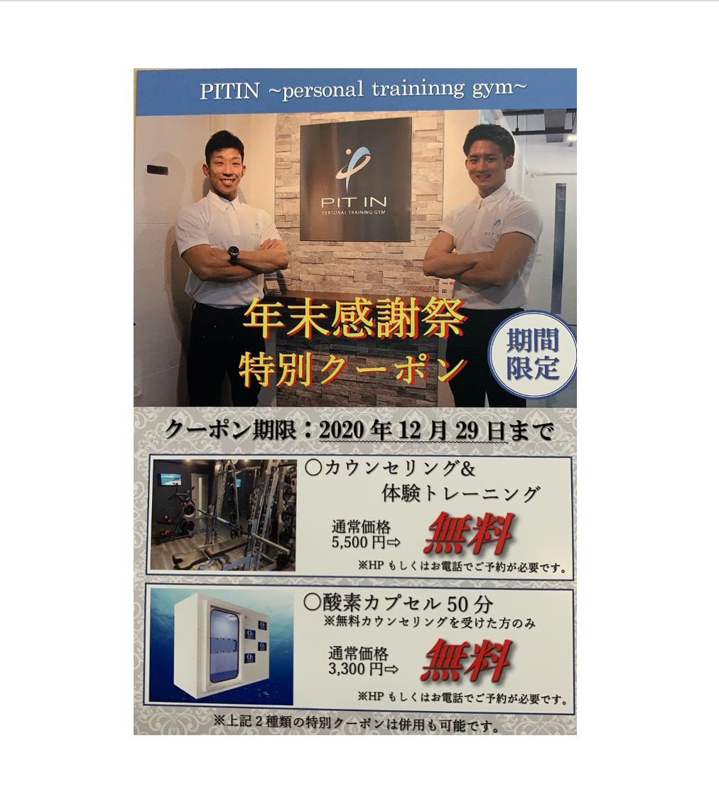PITINでは12月29日まで期間限定で『トレーニング体験』『酸素ボックス50分』を無料でご提供いたします❗️